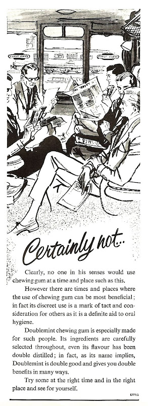 "In 1962, dissatisfied with low sales in Britain, Wrigley launched an educational advertising campaign aimed at ending the social prejudice against gum chewing. "In an effort to illustrate circumstances in which gum chewing was not socially unacceptable, the company ran a series of advertisements over the tagline, 'Certainly not!' "The advertisements featured barristers, businessmen, and students in scenarios where gum chewing might offend others. "The advertisements were taken so seriously by the British public that many wrote to the company demanding to know when and where they could chew gum. "The campaign was altered to depict acceptable circumstances for using the product, and sales began to climb."
