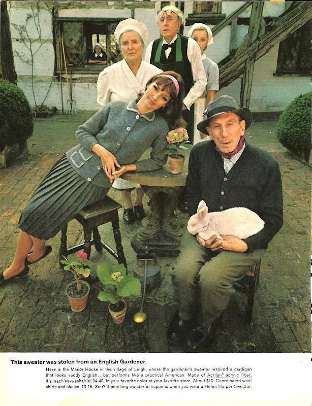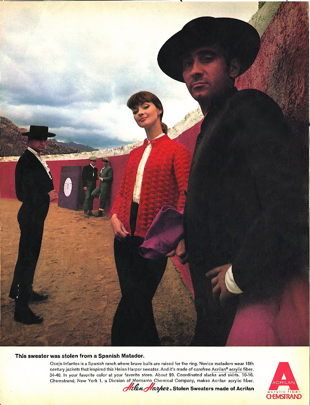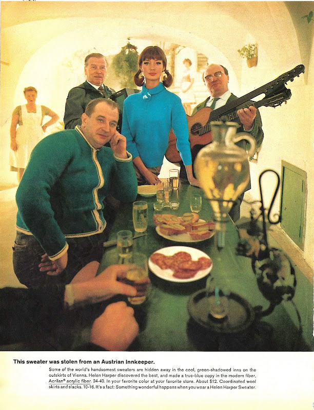 Helen Harper sweaters made of 'Acrilan' acrylic fibers manufactured by Chemstrand (a division of Monsanto), and fashioned to look like authentic regional garb from Ireland, Greece, Austria, Spain, England and Portugal.