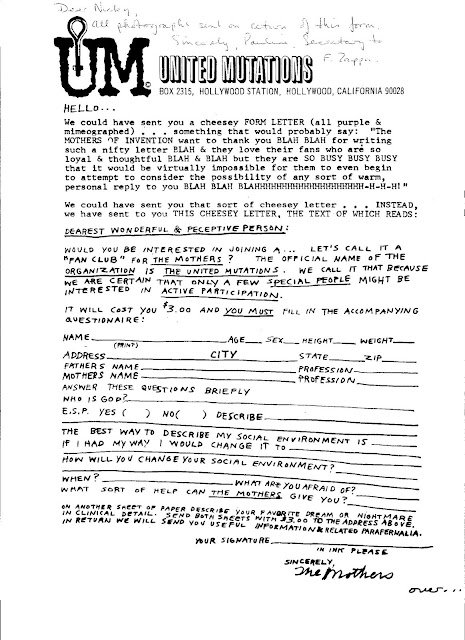 Nick said: "I started getting into Frank Zappa in the 60's, and not long after I sent a letter to U.M. asking about pictures of the band. They sent me the first letter. I still have it, not filled out, in the envelope it came in, with a hand written note from Pauline on it. Maybe brown shoes don't make but this letter does."
