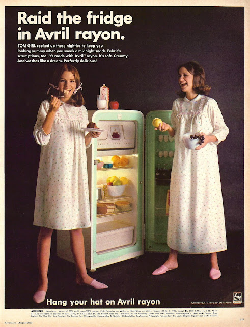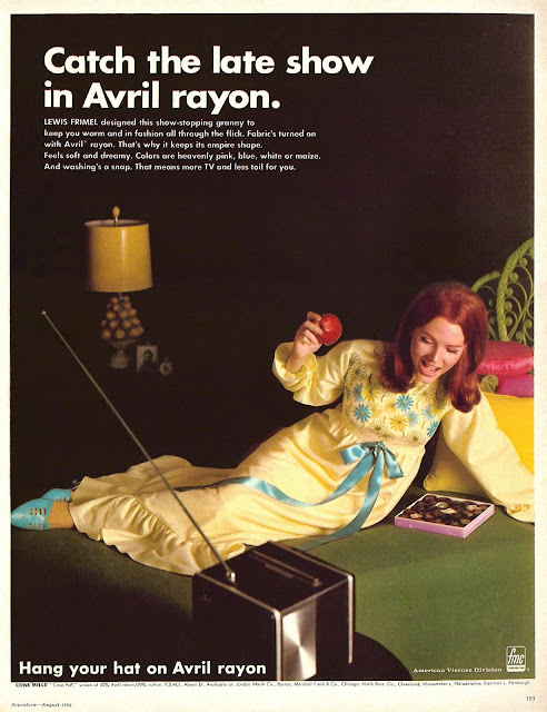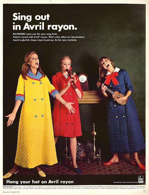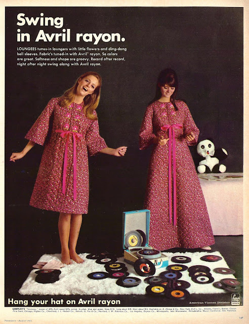 These advertisements ran in the August, 1966 issue of Seventeen magazine, brought to us by the folks at the American Viscose Division of FMC, who wanted to make us all aware of the inherent beauty and functionality of Avril Rayon fabric (as opposed to other high modulus rayons like Avron and Zantrel).