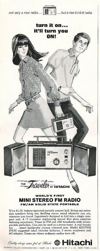 Attached extension speakers that swing-out from this 1967 portable AM/FM stereo's 'single compact unit' evoke the promise of the Boomboxes that Hitachi and everyone else would begin marketing in the '70s.